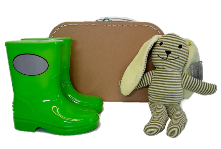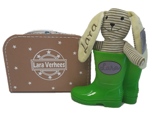 - Groene laarsjes maat 22 bedrukt met naam. Deze zijn voornamelijk bedoelt als decoratie. Bij gebruik kan de sticker loslaten.